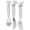 Gyerek evőeszköz - mosogatógépbe alkalmas, acél, szilikon markolat, kanál, villa és kés a csomagban, szürke színben Kisgyermeked már kanállal és villával eszik, de a felnőtt evőeszközök még mindig túl nagyok neki? Tedd élvezetessé számára az étkezéseket a Bo Jungle Grey evőeszközökkel, amelyek kifejezetten