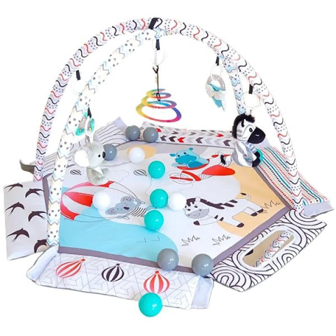 Játszószőnyeg - babáknak, labdák, függő játékok, húzódzkodó, beltéri és kültéri, összecsukható és nem toxikus, anyaga poliészter és pamut, állatos és formák motívum, állvány magassága 56,5 cm, méretek 106 × 106 cm (Sz×Mé) A designos Bo Jungle játszószőnyeg, amely babatornáztatóval is felszerelt, csendes és biztonságos helyet biztosít a baba számára, ahol a saját tempójában játszhat, pihenhet és felfedezheti a világot.