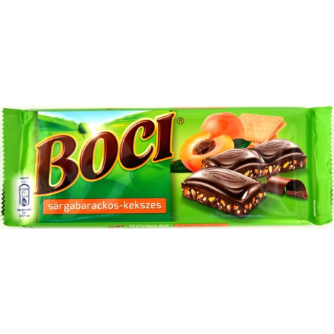 Boci sárgabarackos-kekszes tejcsokoládé 90 g.Kakaó szárazanyag a tejcsokoládéban legalább 33%.