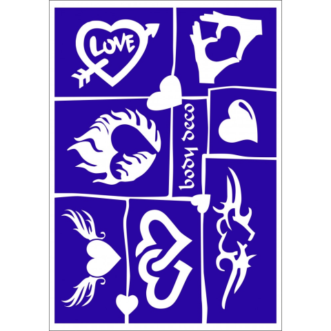 Jellemzői: 7 darab +1 body deco sablon. Összesen 8 darab sablon minta Sablon méret: A5 méretű lapon különböző nagyságú minták Szívek és szerelem mintákkal. A sablon három rétegből áll, mely hennafestésre, arc és testfestésre, csillámtetoválásra, textil
