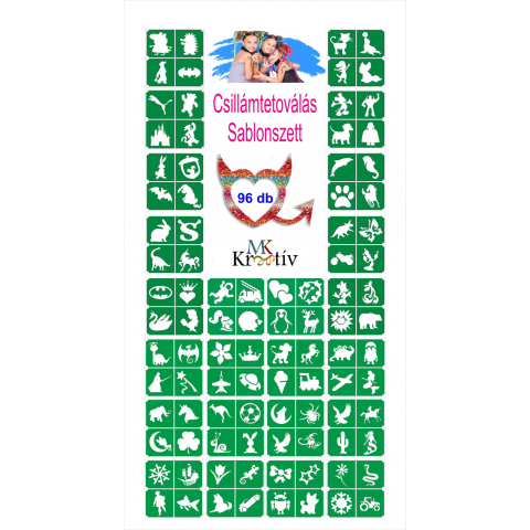 Jellemzői: 24 db. 4 az egyben csillámtetkó sablonok. összesen 96 darab sablon minta sablon méret: 8x8 cm - 4 db 39,2 mm-es minta A sablon három rétegből áll, mely hennafestésre, arc és testfestésre, csillámtetoválásra, textil és üvegfestéshez is alkalma