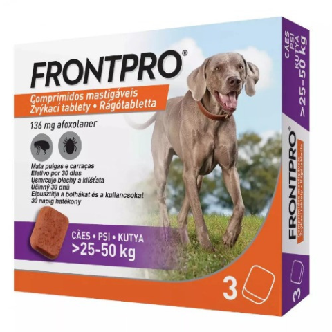 FrontPro Rágótabletta kutyáknak 25-50kg – Újszerű afoxolaner tartalmú, kényelmes és hatékony védekezést kínáló rágótabletta bolha és kullancs fertőzöttség ellen. Használata során nem kerül vegyszer a kutya bőrfelületére, így biztonságosan alkalmazható kis