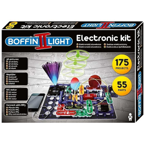 Építőjáték - elektronikus, 55 darabos készlet, anyaga műanyag és fém, ajánlott 8 éves kortól, világító, 175 projekt építéséhez, az összes funkció használatához 4 db AA elem szükséges A Boffin II LIGHT elektronikus építőkészlet több mint 50 alkatrészt tartalmaz, amelyekből olyan projekteket építhetsz, mint a Tranzisztor, 3D képek, Erősítő, Színes orgona, Morze-ábécé, Fénytánc és mé