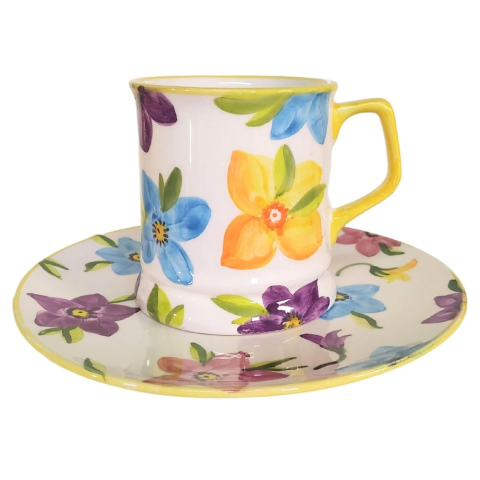 Termék adatai Árvácska bögre és reggeliző tányér Anyaga: kerámia Szín:Máz alatti festék, 1030C-on égetett mázzal bevonva. Bögre :4 dl Tányér átmérő:19.5 cm Bevonat: Károsanyag mentes,fényes máz. Készült: Égetéssel 1030 C-on Termék adatai Anyaga: kerá