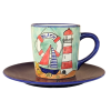 Kapitány bögre és reggeliző tányér Termék adatai Anyaga: kerámia Szín:Színes mázalatti festék Bevonat: Károsanyag mentes,fényes máz. Készült: Égetéssel 1030 C-on Űrméret: 4 dl Tányér átmérő:19,5 cm Kézzel festett bögre Termék adatai Anyaga: kerámia Sz