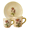 Reggeliző tányér,kávés és teás bögrével. Tányér átmérő:19,5 cm Kávés bögre:2 dl Teás bögre:4 dl Termék adatai Anyaga: kerámia Szín:Színes mázalatti festék Bevonat: Károsanyag mentes,fényes máz. Készült: Égetéssel 1030 C-on Minden egyes darab egyedileg