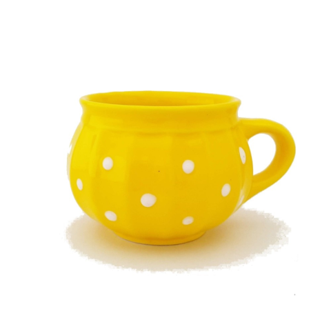 Sárga alapon fehér pöttyös Csupor bögre Termék adatai Anyaga: kerámia Szín: sárga Bevonat: Károsanyag mentes,fényes máz. Készült: Égetéssel 1030 C-on Űrméret: 4,0 dl Mosogatógépben és mikróban is használható. Termék adatai Anyaga: kerámia Szín: sá