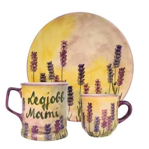 Feliratos Levendula reggeliző szett Nagyszerű ajándék a szeretett személy számára,különösen ha személyes üzenettel díszitik. 4dl és 2 dl bögre Tányér átmérő:19,5 cm Bevonat: Károsanyag mentes,fényes máz. Készült: Égetéssel 1030 C-on Termék adatai Anyag