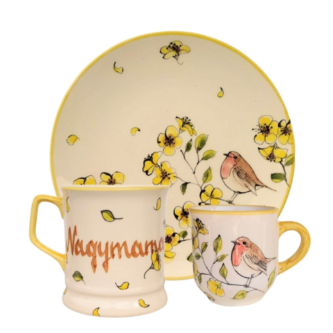 Feliratos Tavaszi madárkás reggeliző szett Nagyszerű ajándék a szeretett személy számára,különösen ha személyes üzenettel díszitik. 4dl és 2 dl bögre Tányér átmérő:19,5 cm Bevonat: Károsanyag mentes,fényes máz. Készült: Égetéssel 1030 C-on Termék adata