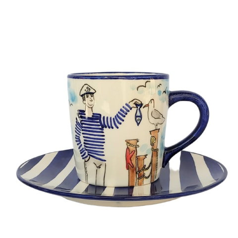 Férfi matróz bögre és reggeliző tányér Termék adatai Anyaga: kerámia Szín:Színes mázalatti festék Bevonat: Károsanyag mentes,fényes máz. Készült: Égetéssel 1030 C-on Űrméret: 4 dl Tányér átmérő:19,5 cm Kézzel festett bögre Termék adatai Anyaga: kerámi