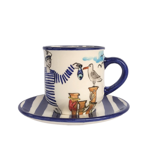 Férfi matróz kávés bögre kistányérral Szín:Színes mázalatti festék Bevonat: Károsanyag mentes,fényes máz. Készült: Égetéssel 1030 C-on Űrméret: 2dl Tányér átmérő:13,5 cm Minden egyes darab egyedileg,kézzel készült és kézzel festett, emiatt előfordulhatna