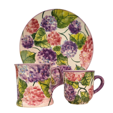 Tegye különlegessé napi csésze teáját, vagy kávéját egy romantikus hortenzia bögrével. Termék adatai Anyaga: kerámia Szín:Máz alatti festék, 1030C-on égetett mázzal bevonva. 2dl és 4dl bögre tányér átmérő:19,5 cm Bevonat: Károsanyag mentes,fényes máz.