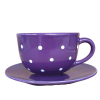 Lila alapon fehér pöttyös Jumbo bögre és reggeliző tányér Bevonat: Károsanyag mentes,fényes máz. Készült: Égetéssel 1030 C-on Űrméret: 6,5 dl Tányér átmérő: 19,5 cm Mosogatógépben és mikróban is használható Termék adatai Anyaga: kerámia Szín: lila Bev