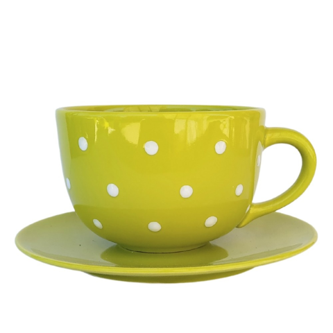 Neon zöld Jumbo bögre és reggeliző tányér Bevonat: Károsanyag mentes,fényes máz. Készült: Égetéssel 1030 C-on Űrméret: 6,5 dl Tányér átmérő: 19,5 cm Mosogatógépben és mikróban is használható. Termék adatai Anyaga: kerámia Szín: neon zöld Bevonat: Kár