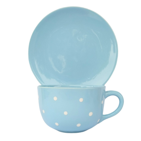 Pasztel kék alapon fehér pöttyös Jumbo bögre és reggeliző tányér Termék adatai Anyaga: kerámia Szín: pasztel kék Bevonat: Károsanyag mentes,fényes máz. Készült: Égetéssel 1030 C-on Űrméret: 6,5 dl Mosogatógépben és mikróban is használható. Termék adata