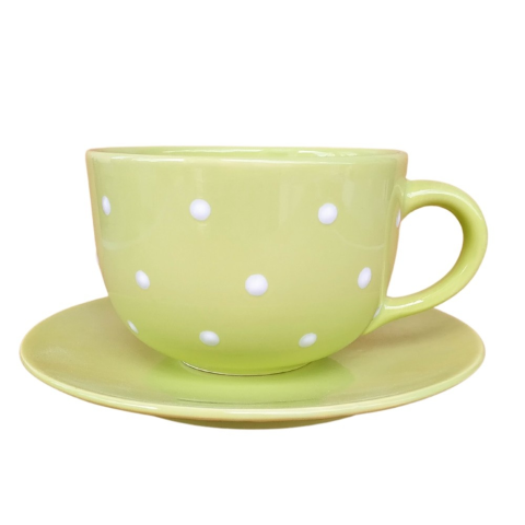 Jumbo bögre és reggeliző tányér Termék adatai Anyaga: kerámia Szín: pasztel zöld Bevonat: Károsanyag mentes,fényes máz. Készült: Égetéssel 1030 C-on Űrméret: 6,5 dl Tányér átmérő:19,5 cm Mosogatógépben és mikróban is használható. Termék adatai Anyaga
