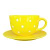 Sárga alapon fehér pöttyös Jumbo bögre és reggeliző tányér Bevonat: Károsanyag mentes,fényes máz. Készült: Égetéssel 1030 C-on Űrméret: 6,5 dl Tányér átmérő: 19,5 cm Mosogatógépben és mikróban is használható. Termék adatai Anyaga: kerámia Szín: sárga