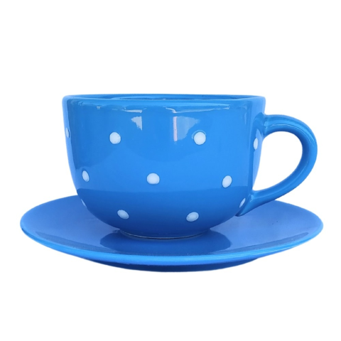 Világos kék alapon fehér pöttyös Jumbo bögre és reggeliző tányér Termék adatai Anyaga: kerámia Szín:világos kék Bevonat: Károsanyag mentes,fényes máz. Készült: Égetéssel 1030 C-on Űrméret: 6,5 dl Mosogatógépben és mikróban is használható. Termék adata