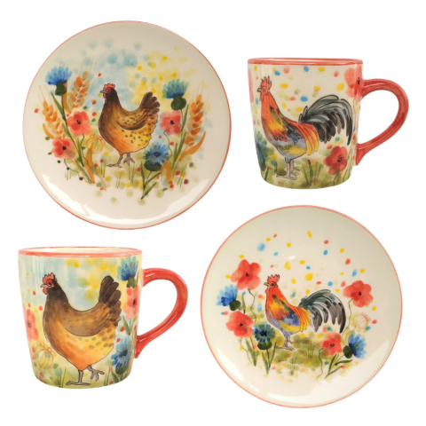 Kakas és tyúk páros szett. 2db bögre és 2db reggeliző tányér. Termék adatai Anyaga: kerámia Szín: Színes mázalatti festék Bevonat: Károsanyag mentes,fényes máz. Készült: Égetéssel 1030 C-on Űrméret: 4 dl Mosogatógépben és mikróban is használható. T