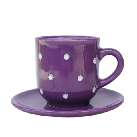 Lila alapon fehér pöttyös Kávés bögre és kistányér Bevonat: Károsanyag mentes,fényes máz. Készült: Égetéssel 1030 C-on Űrméret: 2,0 dl Kistányér átmérő:13,5 cm Mosogatógépben és mikróban is használható Termék adatai Anyaga: kerámia Szín: lila Bevonat: