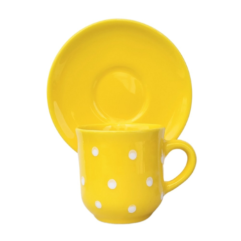 Sárga alapon fehér pöttyös Kávés bögre és kistányér Űrméret: 2 dl Kistényér átmérő: 13,5 cm Bevonat: Károsanyag mentes,fényes máz. Készült: Égetéssel 1030 C-on Űrméret: 2,0 dl Mosogatógépben és mikróban is használható. Termék adatai Anyaga: kerámia Sz