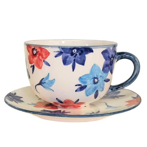 Termék adatai kék virágos jumbó bögre és reggeliző tányér Anyaga: kerámia Szín:Máz alatti festék, 1030C-on égetett mázzal bevonva. 6,5d Tányér átmérője:19,5cm Bevonat: Károsanyag mentes,fényes máz. Készült: Égetéssel 1030 C-on Termék adatai Anyaga: k