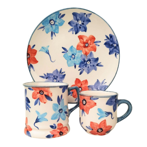 Kék virágos reggeliző szett Reggeliző tényér átmérő: 19,5 cm Teás bögre:4 dl Kávés bögre:2 dl Termék adatai Anyaga: kerámia Szín:Máz alatti festék, 1030C-on égetett mázzal bevonva. Bevonat: Károsanyag mentes,fényes máz. Készült: Égetéssel 1030 C-on Min