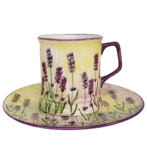 Termék adatai Levendula bögre és reggeliző tányér Anyaga: kerámia Szín:Máz alatti festék, 1030C-on égetett mázzal bevonva. Bögre:4dl Tányér átmérő:19,5 cm Bevonat: Károsanyag mentes,fényes máz. Készült: Égetéssel 1030 C-on Termék adatai Anyaga: kerám
