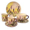 Levendula reggeliző nagy szett Reggeliző tényér átmérő: 19,5 cm-2 db Jumbó bögre:6,5 dl-1 db Teás bögre:4 dl-1 db Kávés bögre:2 dl-1 db Kávés kistányér:13,5 cm-1 db Termék adatai Anyaga: kerámia Szín:Máz alatti festék, 1030C-on égetett mázzal bevonv