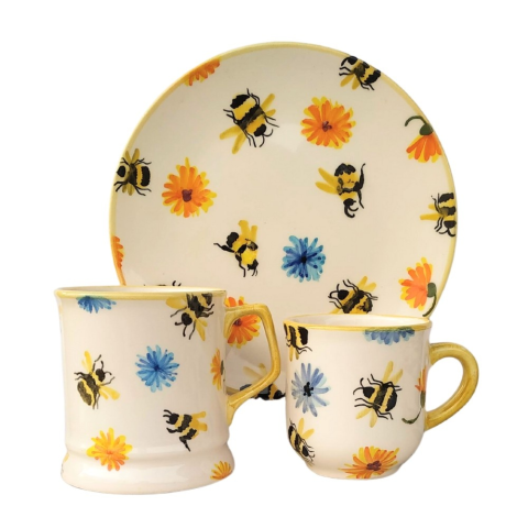 Termék adatai Méhecskés reggeliző szett Anyaga: kerámia Szín:Máz alatti festék, 1030C-on égetett mázzal bevonva. Bögre:4dl és 2 dl Tányér átmérő:19,5 cm Bevonat: Károsanyag mentes,fényes máz. Készült: Égetéssel 1030 C-on Termék adatai Anyaga: kerámia