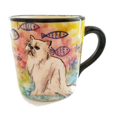 Kézzel festett bögre. Termék adatai: Anyaga: Kerámia Szín: Színes mázalatti festék Bevonat: Károsanyag mentes,fényes máz. Készült: Égetéssel 1030 C-on Űrméret: 4 dl Mosogatógépben és mikróban is használható. Termék adatai: Anyaga: Kerámia Szín: Szí