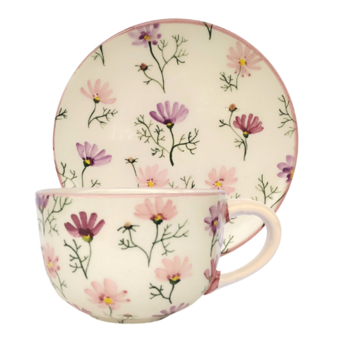 Termék adatai Pille virág jumbó bögre és reggeliző tányér Anyaga: kerámia Szín:Máz alatti festék, 1030C-on égetett mázzal bevonva. 6,5d Tányér átmérője:19,5cm Bevonat: Károsanyag mentes,fényes máz. Készült: Égetéssel 1030 C-on Termék adatai Anyaga: k