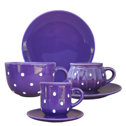 Reggeliző szett 6 részes Bevonat: Károsanyag mentes,fényes máz. Készült: Égetéssel 1030 C-on Űrméret: 4dl ,2dl, 6,5dl Tányér átmérő: 19,5 cm Mosogatógépben és mikróban is használható Termék adatai Anyaga: kerámia Szín: lila Bevonat: Károsanyag mentes,f
