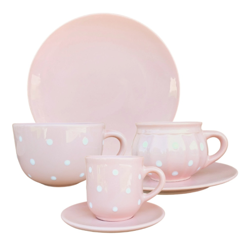 pasztel rózsa alapon fehér pöttyös reggeliző szett 6részes Termék adatai Anyaga: kerámia Szín: pasztel rózsa Bevonat: Károsanyag mentes,fényes máz. Készült: Égetéssel 1030 C-on Űrméret: 2 dl és 4 dl tányér átmérő:19,5 cm Mosogatógépben és mikróban is ha