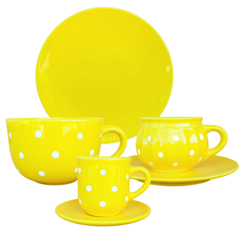 Reggeliző nagy szett 6 részes Bevonat: Károsanyag mentes,fényes máz. Készült: Égetéssel 1030 C-on Űrméret: 4 dl és 2dl Tányér átmérő: 19,5 cm Mosogatógépben és mikróban is használható. Termék adatai Anyaga: kerámia Szín: sárga Bevonat: Károsanyag me