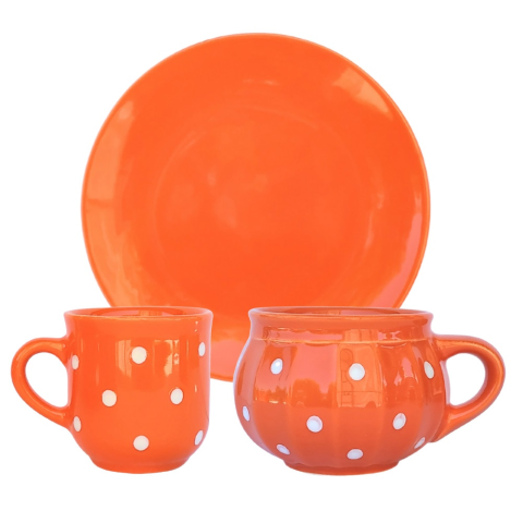 Reggeliző szett 3 részes Bevonat: Károsanyag mentes,fényes máz. Készült: Égetéssel 1030 C-on Űrméret: 4dl, 2dl, Tányér átmérő: 19,5 cm Mosogatógépben és mikróban is használható. Termék adatai Anyaga: kerámia Szín: narancs Bevonat: Károsanyag mentes,fén