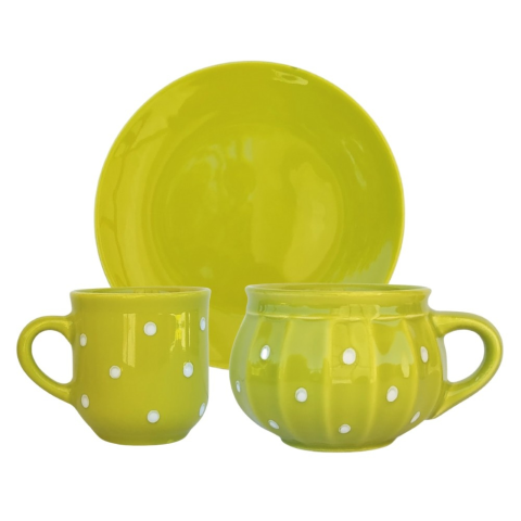 Neon zöld reggeliző szett 3 részes Bevonat: Károsanyag mentes,fényes máz. Készült: Égetéssel 1030 C-on Űrméret: 2 dl és 4 dl Tányér átmérő: 19,5 cm Mosogatógépben és mikróban is használható. Termék adatai Anyaga: kerámia Szín: neon zöld Bevonat: Káros