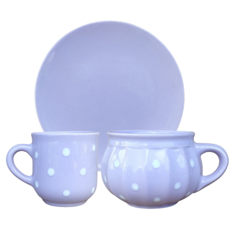 Reggeliző szett 3 részes Bevonat: Károsanyag mentes,fényes máz. Készült: Égetéssel 1030 C-on Űrméret:2dl, 4dl Tányér átmérő:19,5 cm Mosogatógépben és mikróban is használható. Termék adatai Anyaga: kerámia Szín: pasztel lila Bevonat: Károsanyag mentes,f