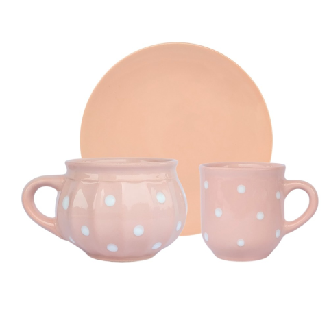 pasztel rózsa alapon fehér pöttyös reggeliző szett 3 részes Termék adatai Anyaga: kerámia Szín: pasztel rózsa Bevonat: Károsanyag mentes,fényes máz. Készült: Égetéssel 1030 C-on Űrméret: 2 dl és 4 dl tányér átmérő:19,5 cm tányér átmérő: 19,5cm Mosogatóg
