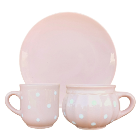 pasztel rózsa alapon fehér pöttyös reggeliző szett 3 részes Termék adatai Anyaga: kerámia Szín: pasztel rózsa Bevonat: Károsanyag mentes,fényes máz. Készült: Égetéssel 1030 C-on Űrméret: 2 dl és 4 dl tányér átmérő:19,5 cm tányér átmérő: 19,5cm Mosogatóg