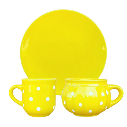 Reggeliző szett 3 részes Bevonat: Károsanyag mentes,fényes máz. Készült: Égetéssel 1030 C-on Űrméret: 4 dl és 2dl Tányér átmérő: 19,5 cm Mosogatógépben és mikróban is használható. Termék adatai Anyaga: kerámia Szín: sárga Bevonat: Károsanyag mentes,f