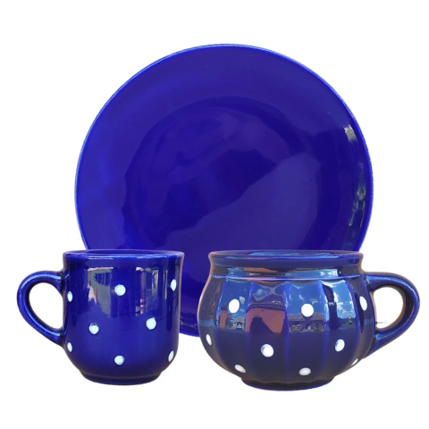 JReggeliző szett 3 részes Bevonat: Károsanyag mentes,fényes máz. Készült: Égetéssel 1030 C-on Űrméret: 4 dl, 2dl Tányér átmérő:19,5 cm Mosogatógépben és mikróban is használható. Termék adatai Anyaga: kerámia Szín: sötét kék Bevonat: Károsanyag mentes,f