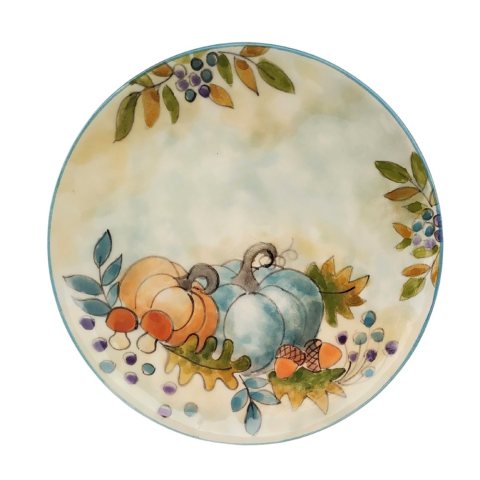Termék adatai Reggelizős festett tányér Kék tökös Anyaga: kerámia Szín:Máz alatti festék, 1030C-on égetett mázzal bevonva. Átmérő:19,5 cm Bevonat: Károsanyag mentes,fényes máz. Készült: Égetéssel 1030 C-on Minden egyes darab egyedileg,kézzel készült