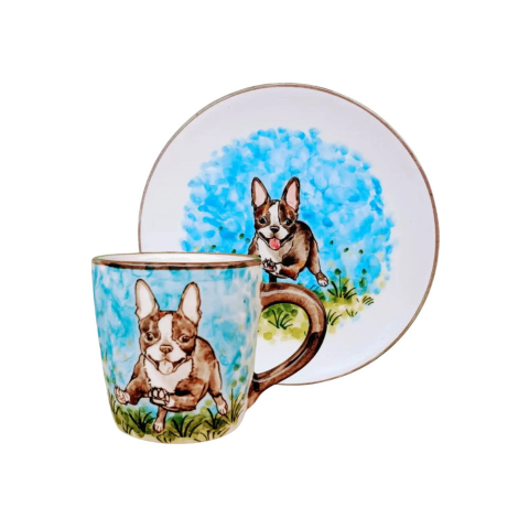 A Boston terrier kutyás bögre és reggeliző tányér 1030 C-on készül, égetéses módszerrel. Minden egyes darab egyedileg, kézzel készült és kézzel festett, emiatt előfordulhatnak apróbb hibák, amelyek minden darabot még egyedibbé és különlegesebbé tesznek. A