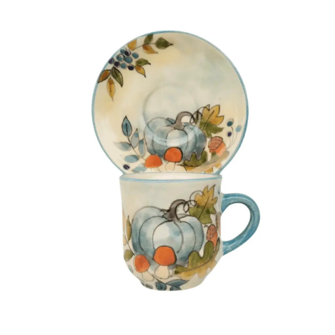 Termék adatai: Anyaga: KerámiaSzín: Máz alatti festék, 1030C-on égetett mázzal bevonva.Űrméret: 2dl Kistányér átmérő: 13,5 cmBevonat: Károsanyag mentes,fényes máz.Készült: Égetéssel 1030 C-on Minden egyes darab egyedileg,kézzel készült és kézzel festett,