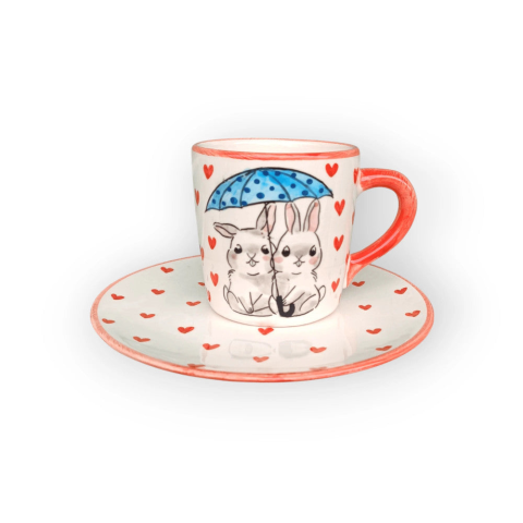A Valentin napi nyuszipár bögre reggeliző tányérral 1030 C-on készül, égetéses módszerrel. Minden egyes darab egyedileg, kézzel készült és kézzel festett, emiatt előfordulhatnak apróbb hibák, amelyek minden darabot még egyedibbé és különlegesebbé tesznek.