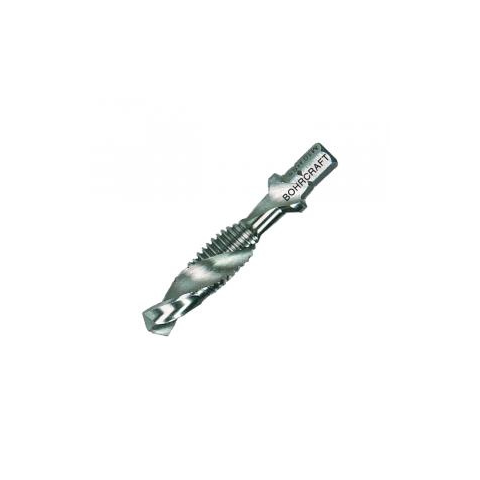BOHRCRAFT Metrikus kombinált gépi menetfúró HSS-G • Csavarthornyú, HSS-G anyagminőségű, kombinált gépi menetfúró 1/4" hatszög szárral • 60 fokos profilszöggel, normál metrikus menetek készítéséhez • A munkadarab vastagsága nem haladhatja meg a menet külső átmérőjét