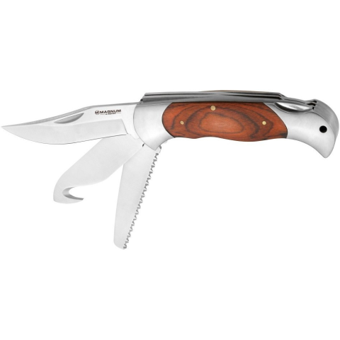 A Magnum Classic Hunter egy hagyományos, kiváló vadász zsebkés Mindhárom 440-es rozsdamentes acél penge Backlock mechanizmussal zárható, amely kizárja a penge véletlen behajtását. A modell tartalmaz egy Bowie pengét, egy akasztóhorogot (zsigerelő) és egy fa- és csontfűrészt. A fa részek gyönyörű kontrasztot alkotnak a rozsdamentes acél támasztékkal, és teljessé teszik az összképet. Többfunkciós kés a következő vadászatra, trekkingre vagy gyalogtúrára. A bi