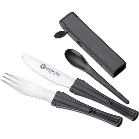 Praktikus, kis helyet foglaló evőeszközkészlet kanállal, késsel és villával, valamit só- és borsszóróval A Boker Snac Pac behelyezhető az ebédlődobozba, a hátizsákba vagy a kesztyűtartóba. A teljes evőeszköz egy 420-as rozsdamentes acél késből, egy villából és egy desszertes kanálból áll. A kompakt készlet a praktikus, polipropilénből készült szintetikus tokban tárolható használat előtt és után is. (A polipropilén a valaha volt legkönnyebb szintetikus