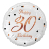Happy Birthday White-Rose Gold 30 fólia lufi 36 cm Fólia léggömb, mely héliummal vagy levegővel tölthető. A lufi önzárószeleppel van ellátva, amely megakadályozza a gáz elszökését. Mérete 36 cm Anyaga: fólia A lufi tartó pálca + csésze külön megvásá